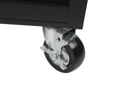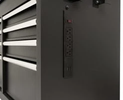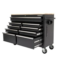 The Kobalt 46 in. 9 drawer mobile workbench is great for storing and organizing all your tools and hardware. The unit is made from high grade all welded steel construction with a tough, rust-resistant powder coat finish. 9 Drawers are soft-close full-extension and glide effortlessly on ball-bearing slides that can support up to 100 lbs. solid wood top with protective coating provides great work surface. You can charge your electronics and power tools even when the chest is locked via the integrated power strip with 4-outlets and 2-USB ports. An ergonomic handle and 5 in. x 2 in. casters allow you to easily move your cabinet around your workspace. Total weight capacity of the unit is 1,200lbs.