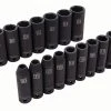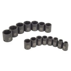 - 1/2-In drive impact socket set contains SAE sizes 3/8, 7/16, 1/2, 9/16, 5/8, 11/16, 3/4, 13/16, 7/8, 15/16, 1, 1-1/16, 1-1/8, 1-3/16 and 1-1/4-in